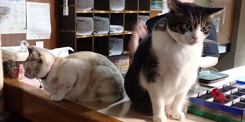 The corridors and shared spaces of the inn double as playgrounds for the resident cats.