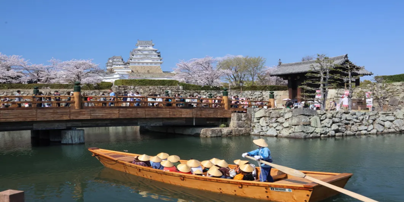 The traditional Japanese wooden boat cruise circles the inner moat surrounding Himeji Castle.