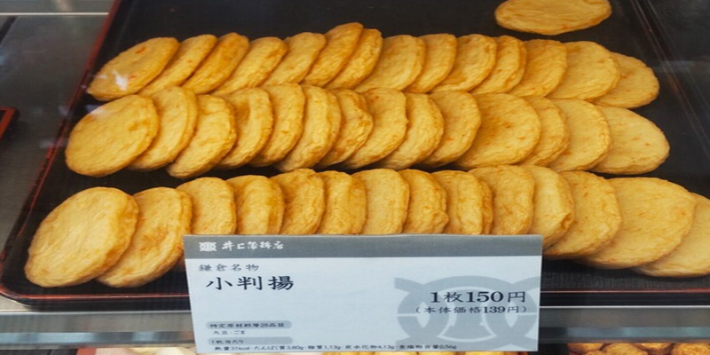 The long-established Inoue Kamaboko-ten, whose main shop is located near Kamakura Station, is one of Kamakura’s best-known stores for handmade kamaboko (fish cake). Their most popular street food item is “Koban-age”, served hot and freshly fried at the storefront. This crispy snack is made from fish paste with a pleasantly springy texture, and it tastes great either plain or with a little soy sauce.